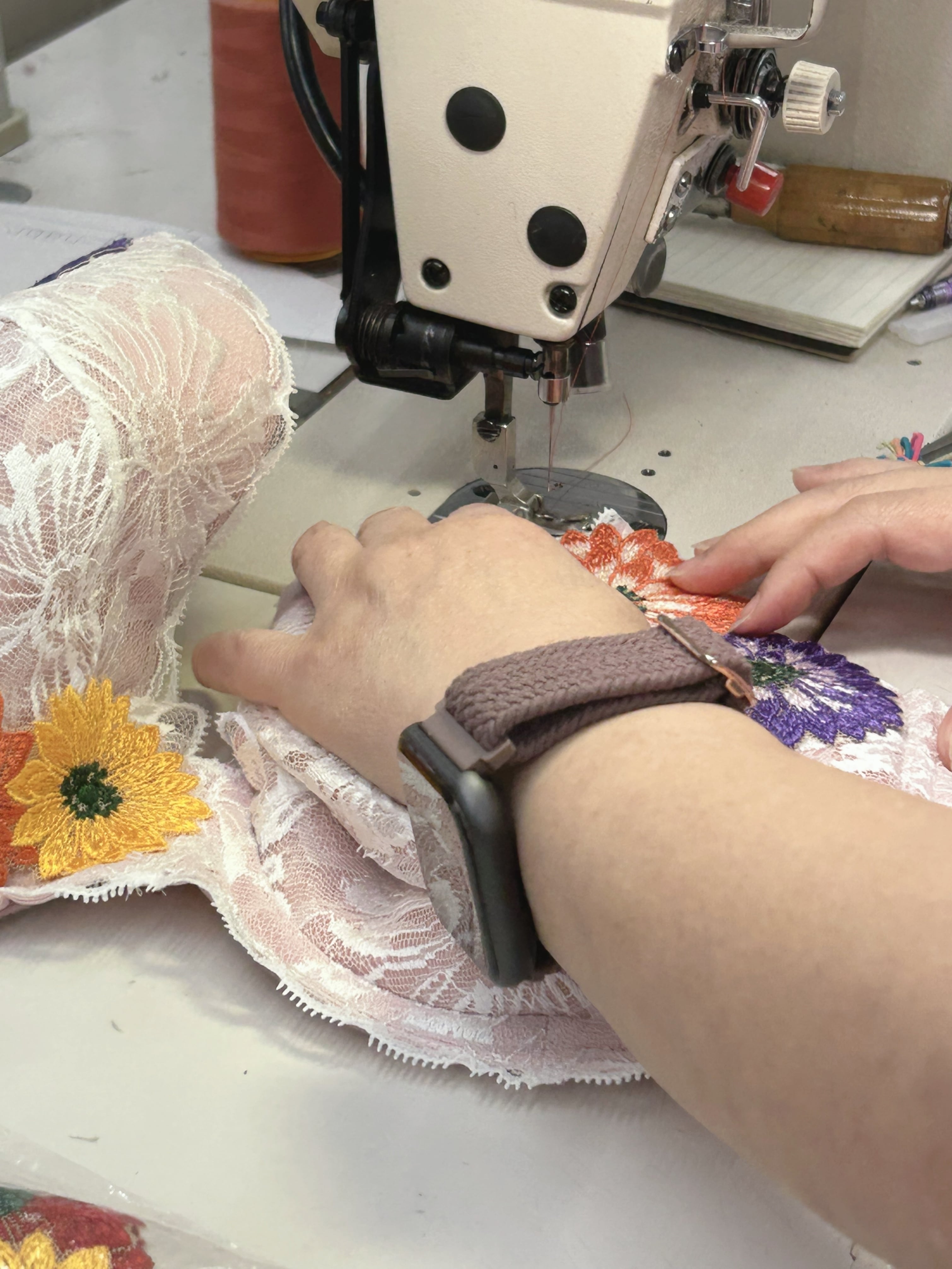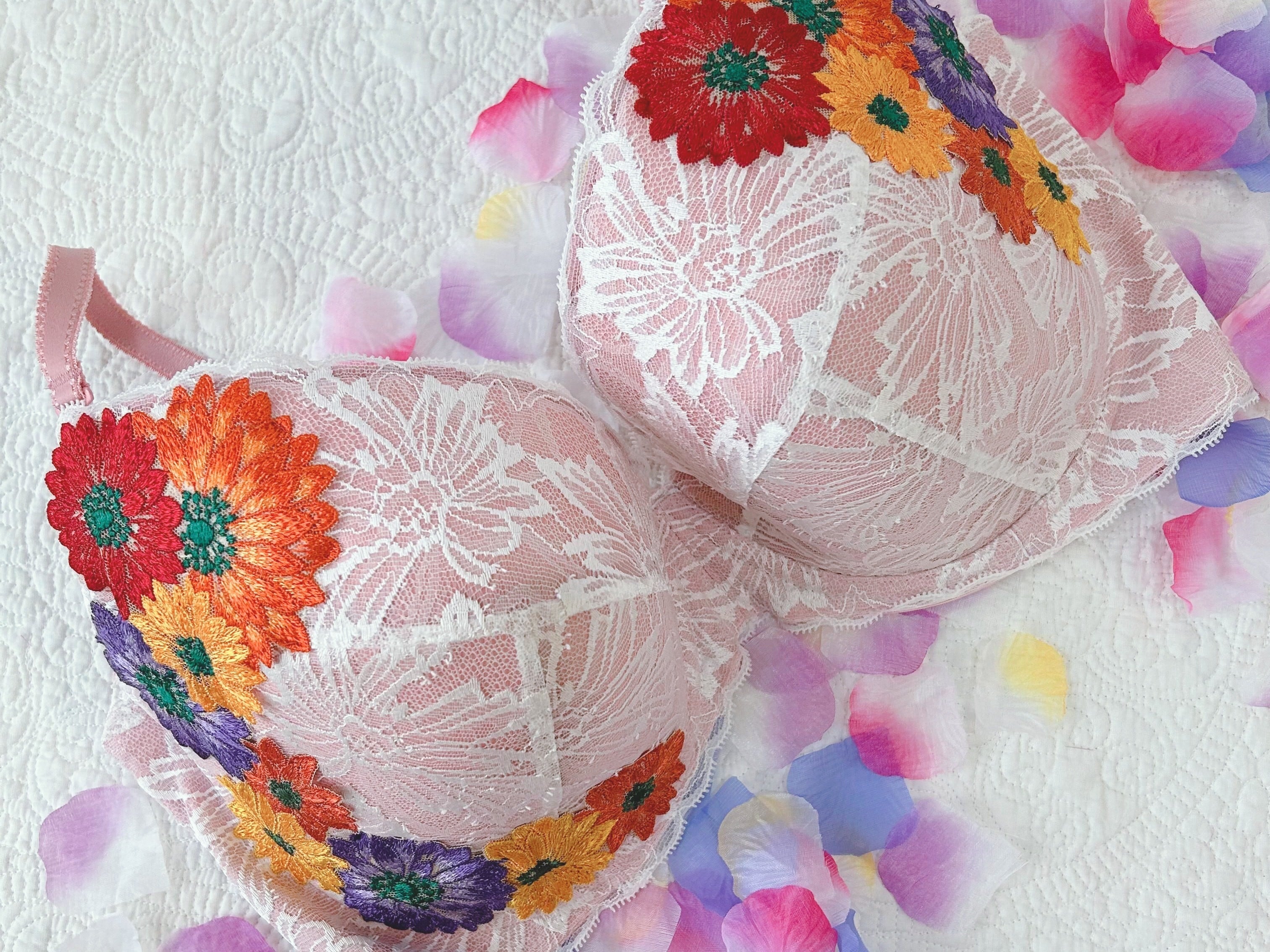 ガーベラモチーフのアップリケ付きブラジャー。唯一無二のブラジャー、自分が製作したい下着がやっと完成。ホワイトの主役はガーベラアップリケ、花の色彩を存分に楽しめる着るだけでワクワクするデザイン。個人的に1番苦労したアップリケが主役になれるのでおススメです。thinkmine...のInstagramを初期からご存知の方は、アップリケの進化にお気づきかもしれません。配色バランスを変え、大人のアップリケとして帰ってきました。レースの女王と言われる【リバーレース】を贅沢に使用し、軽やかな素材感が心地よく、普段使いから特別な日まで幅広くご利用いただけます。カップの形状やホック位置、サイドボーンの角度等、細部に配慮し、着用感は【1枚の布でバストを包み込まれている、今までにない感覚】。ゴムフリーならではの、窮屈さ無しでバストを美しくメイクしてくれる、長年の歳月をかけグラマーさんの為に作られた、ブラジャーになります。★写真サイズE70★ ※アップリケの取り付け糸がカップ裏に出ています。縫製する際にどうしても発生します。写真5、6枚目に載せておりますのでご確認の上、気になる方はご遠慮ください。 ※使用しているリバーレースは、アイラッシュと言われるレースの端にフリンジやまつ毛のような糸がありますが、糸のほつれ等では無く、リバーレース機を使用して編んでいく工程で出来たものです。写真にてご確認をお願いいたします。 ■カラー/サイズ/バリエーション ・カラー: ホワイト ・サイズ: E65~J95 ストラップ18mm。パット無し。 ※自社製品は、補正効果がある為、通常採寸サイズより1カップ大きめを選択ください。 アンダーサイズは採寸通りを選択ください。詳細は、写真8枚目のサイズ表のご確認をお願いいたします。 ■素材/製造国 ・素材: ポリエステル、ポリウレタン、綿 ・製造国: 日本 ■お手入れ/取り扱い注意事項 ・手洗いを推奨します。 ・漂白剤の使用は避けてください。 ・直射日光の当たる場所での乾燥はお控えください。 ■発送・注文に関する情報や注意事項 ・ご注文から発送までの目安は、約1.5カ月です。1着ずつ丁寧に手作業にて縫製していく為、お時間いただくことをご了承ください。 ・返品について 当店では、お客様都合による返品は受け付けておりません。 商品の製造、発送には万全の注意を払っておりますが、商品不良の場合や、輸送中のトラブルによる破損、汚損に限り、往復送料等を弊社負担にて同一商品と交換させていただきます。 ※商品到着後、8日以内にご連絡をお願いいたします。また、お客様が汚損、破損、使用された商品に関しては、交換対応できませんので、ご了承ください。 ・サイズ交換について 事前に公式LINE等でご連絡いただいたお客様に限り、1回のみ往復送料自社負担で対応いたします。お時間を再度いただくようになりますが、ご了承いただきますようお願いいたします。 ※商品到着後、8日以内にご連絡をお願いいたします。また、お客様が汚損、破損、使用された商品に関しては、交換対応できませんので、ご了承ください。 ■その他の情報や注意事項 ・サイズ選びに不明点がある場合は、お問い合わせください。 ・価格には消費税が含まれています。 ・海外発送は対応しておりませんので、ご了承ください。 商品に関するご質問等は、ショップのお問い合わせからお気軽にご連絡ください。あなたのライフスタイルに寄り添った素敵な下着をご体験ください。