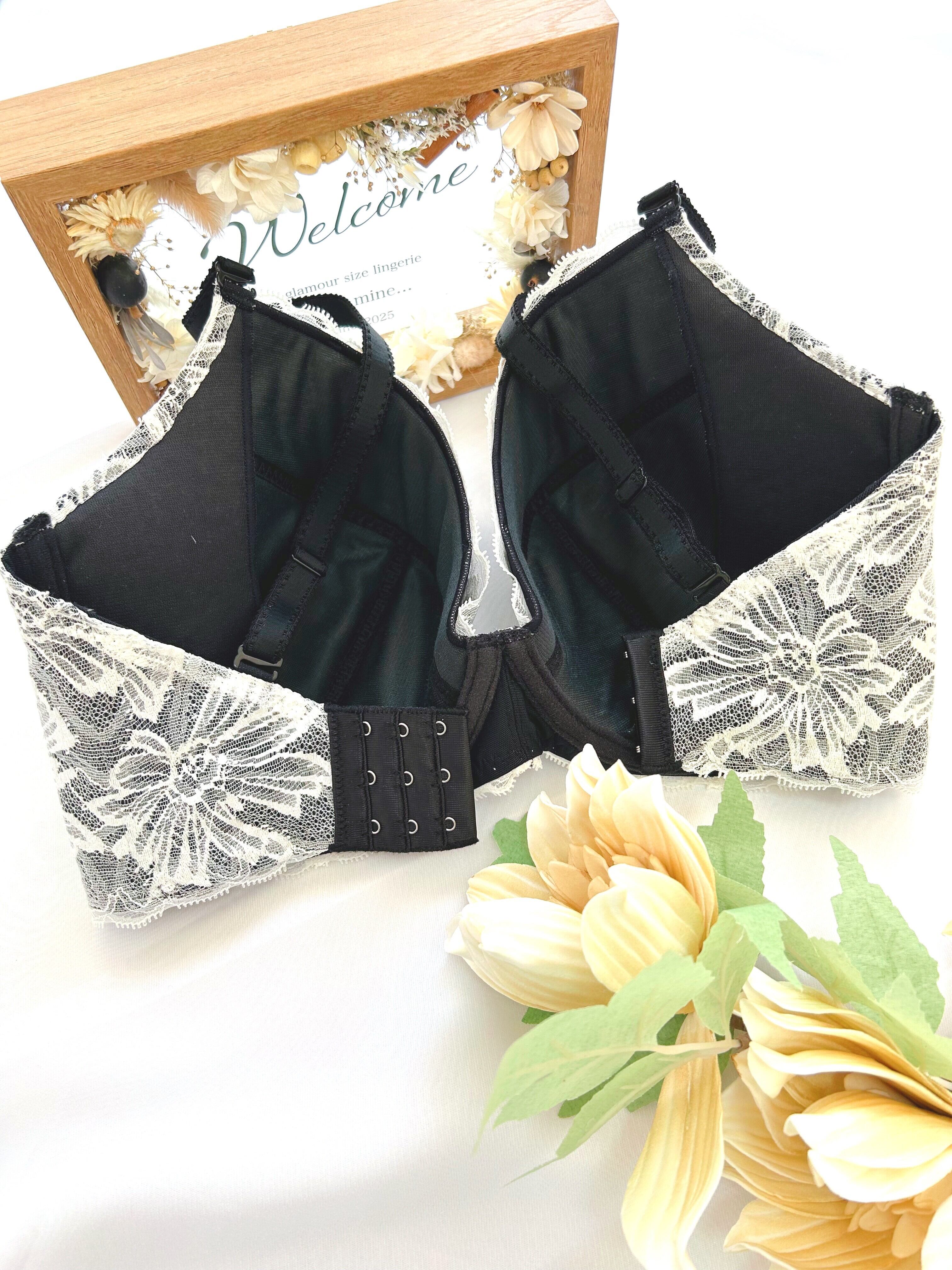 チャレンジしやすい色味のガーベラブラジャーブラックは、シンプルなカラーが魅力的で、洗練された印象を与えてくれるデザインです。レースの女王と言われる【リバーレース】を贅沢に使用し、軽やかな素材感が心地よく、普段使いから特別な日まで幅広くご利用いただけます。カップの形状やホック位置、サイドボーンの角度等、細部に配慮し、着用感は【1枚の布でバストを包み込まれている、今までにない感覚】。ゴムフリーならではの、窮屈さ無しでバストを美しくメイクしてくれる、長年の歳月をかけグラマーさんの為に作られた、ブラジャーになります。