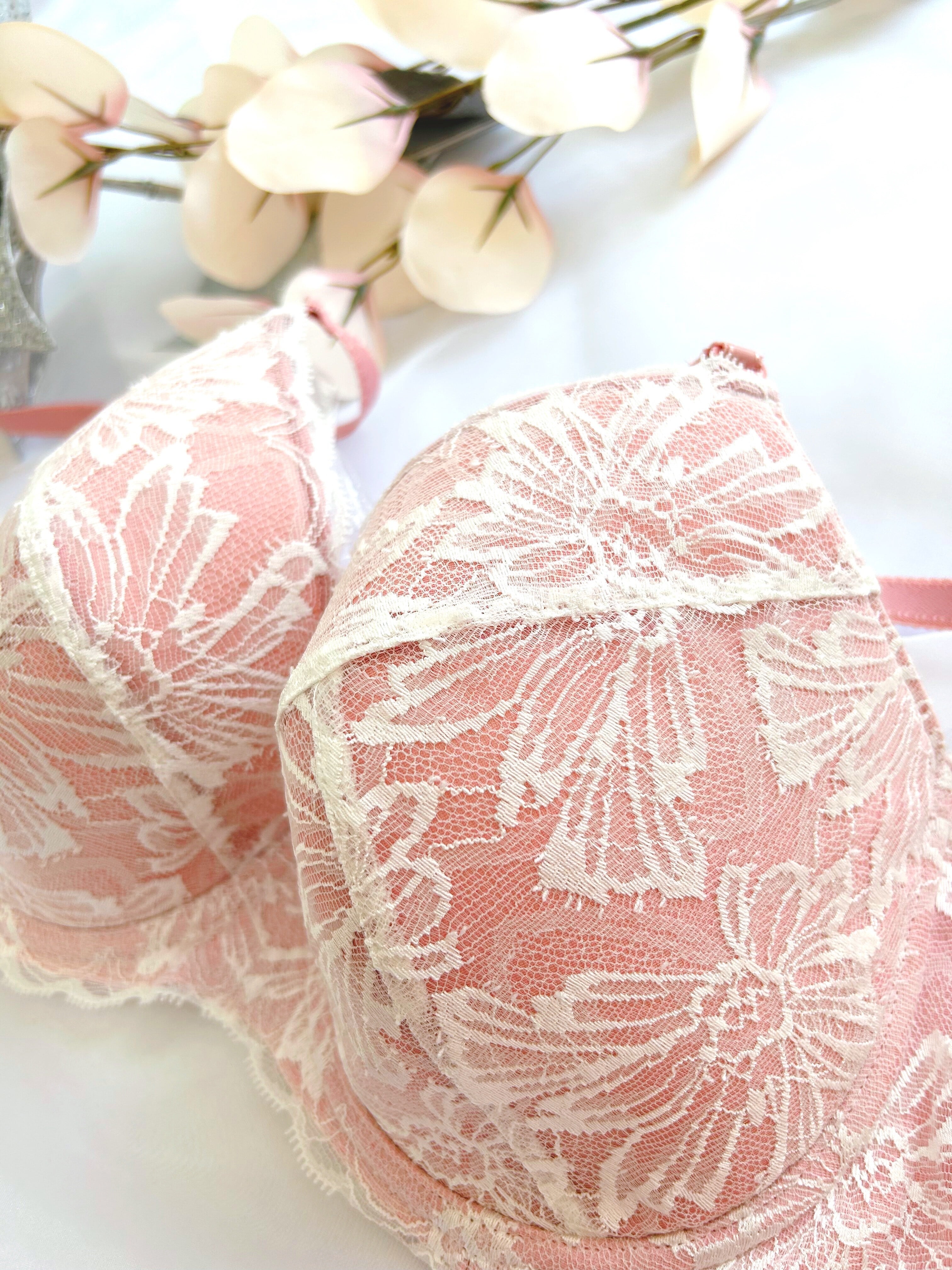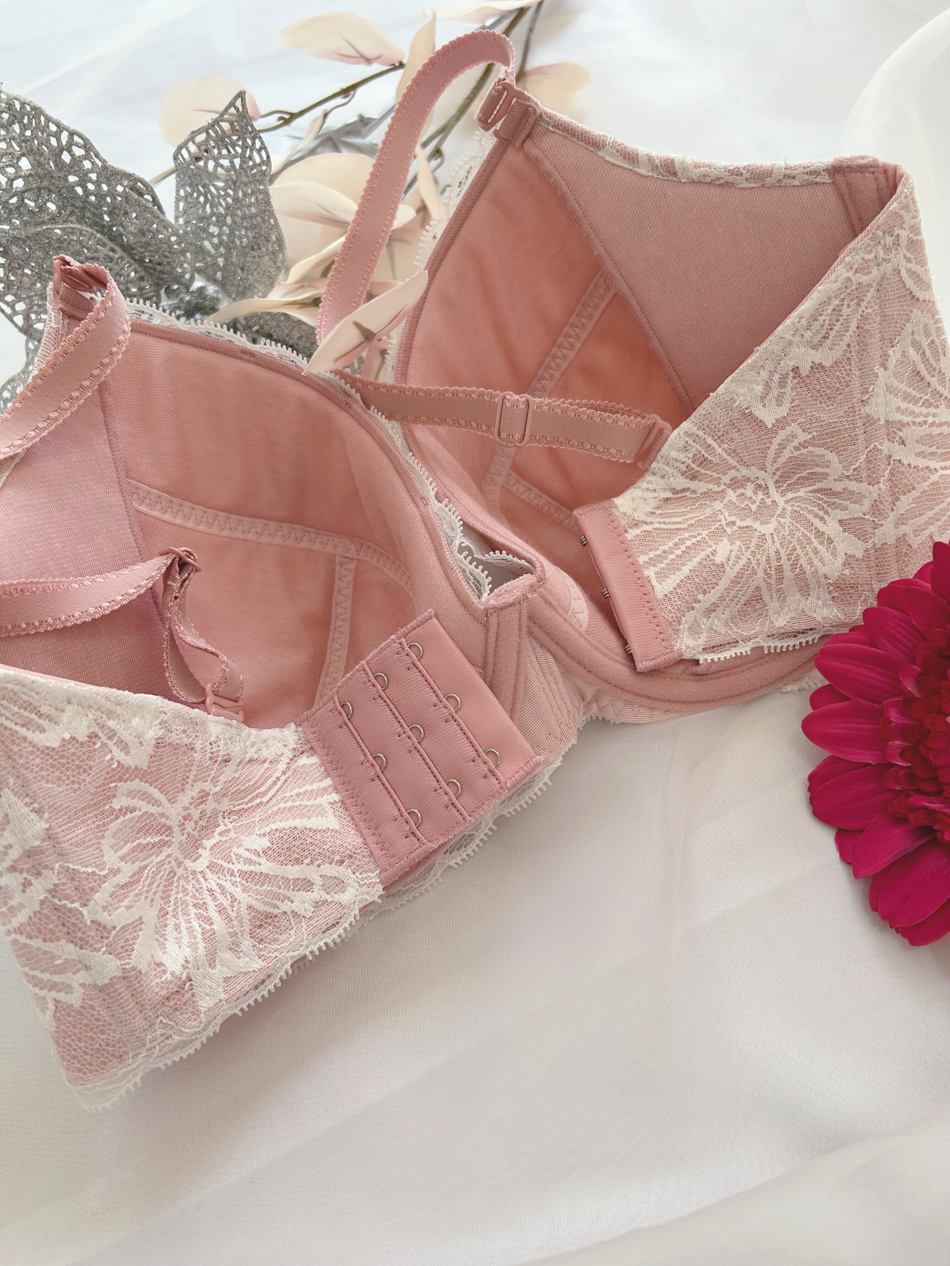 下着の人気色であるガーベラブラジャー ピンクは、華やかなピンク色が魅力的なデザインで、気分を明るくしてくれるアイテムです。レースの女王と言われる【リバーレース】を贅沢に使用し、軽やかな素材感が心地よく、普段使いから特別な日まで幅広くご利用いただけます。カップの形状やホック位置、サイドボーンの角度等、細部に配慮し、着用感は【1枚の布でバストを包み込まれている、今までにない感覚】。ゴムフリーならではの、窮屈さ無しでバストを美しくメイクしてくれる、長年の歳月をかけグラマーさんの為に作られた、ブラジャーになります。