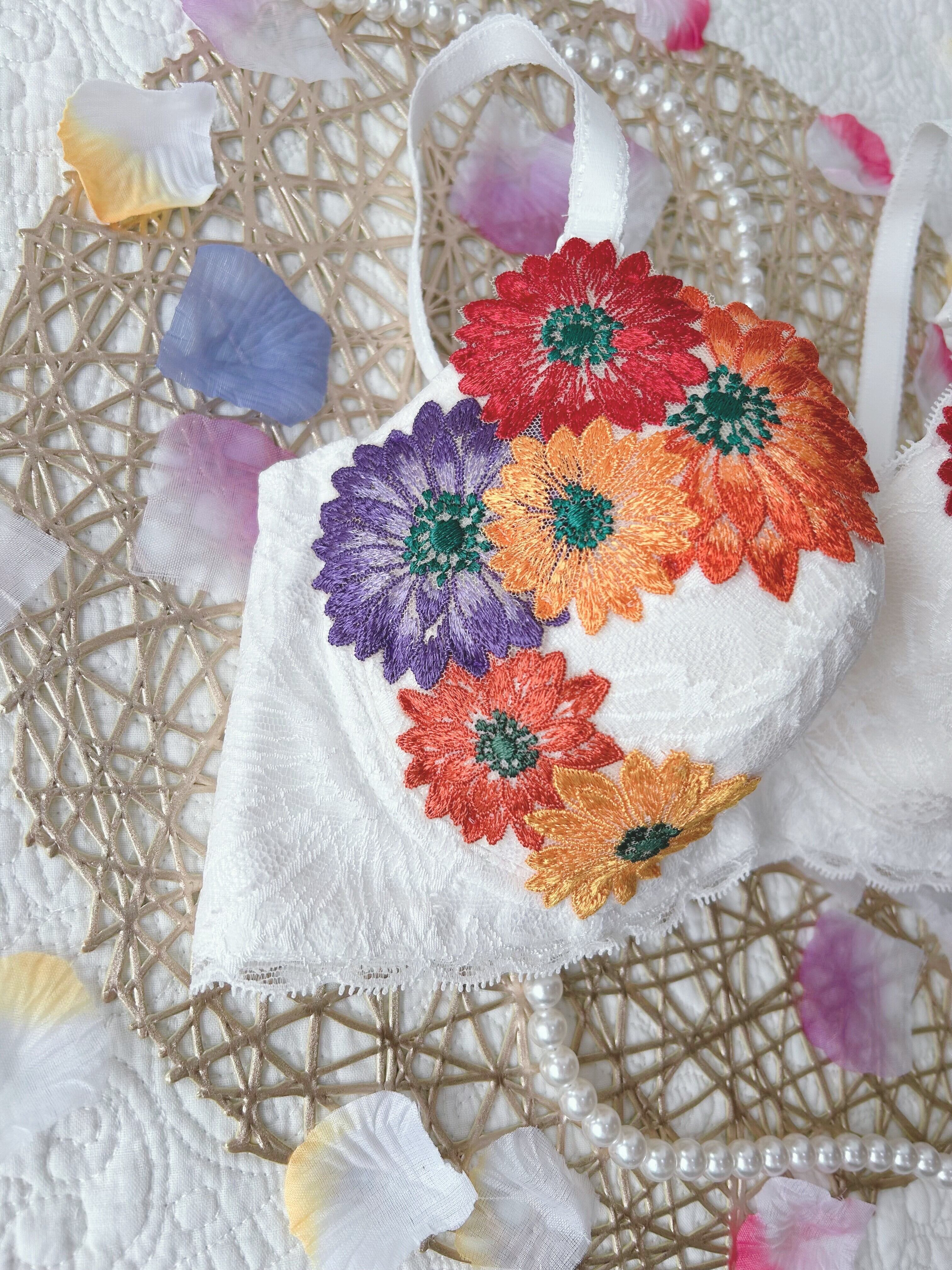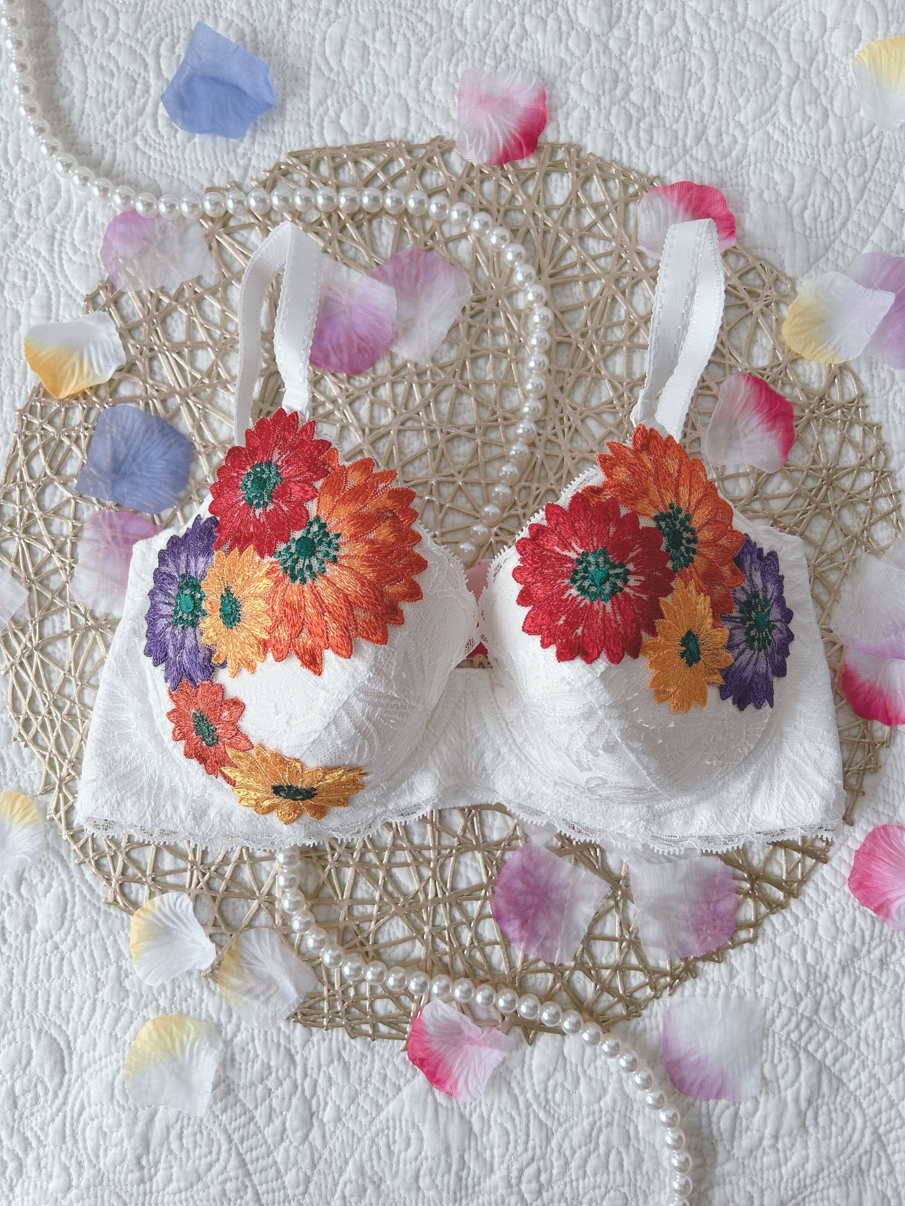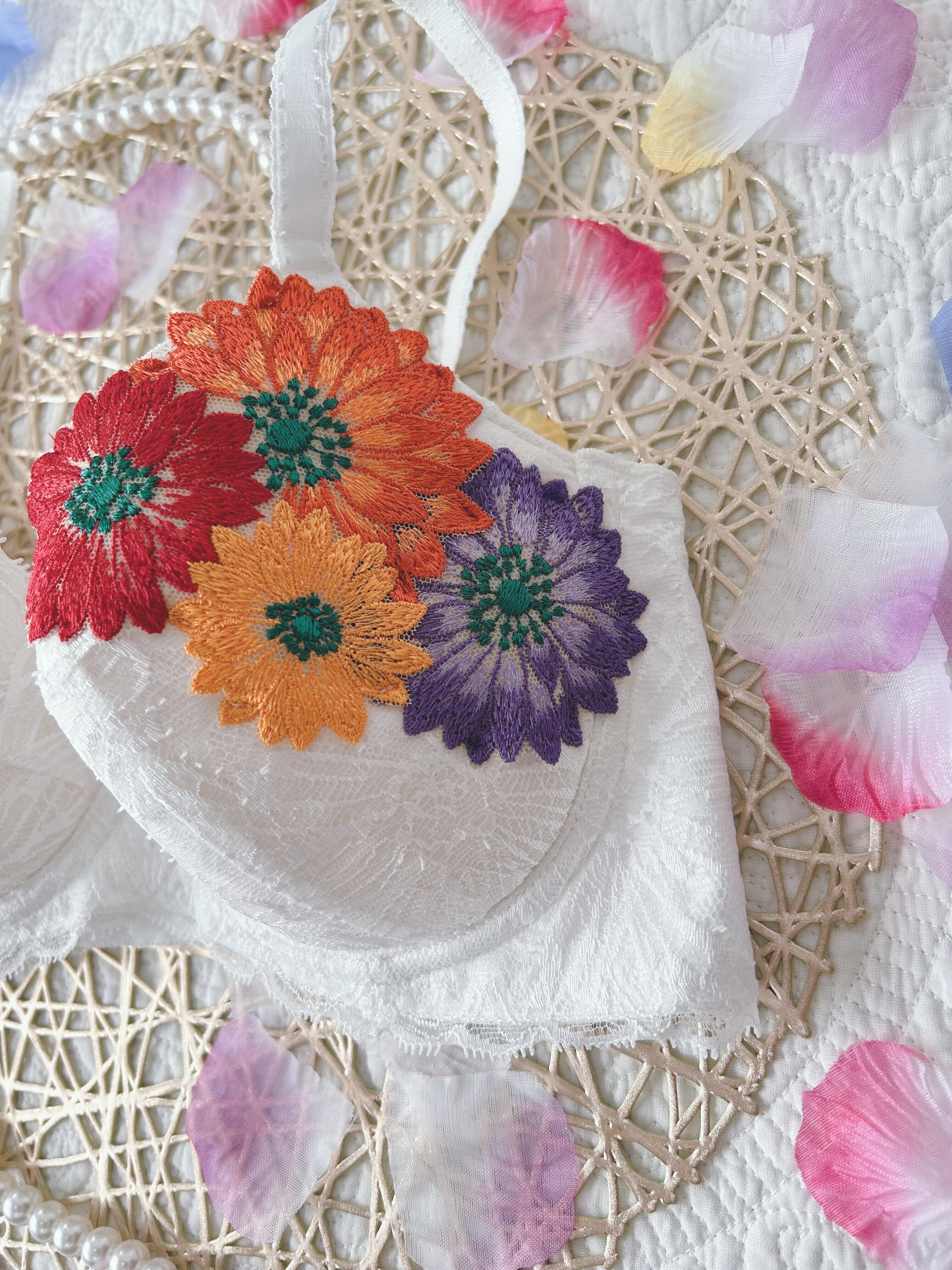 ガーベラモチーフのアップリケ付きブラジャー。唯一無二のブラジャー、自分が製作したい下着がやっと完成。ホワイトの主役はガーベラアップリケ、花の色彩を存分に楽しめる着るだけでワクワクするデザイン。個人的に1番苦労したアップリケが主役になれるのでおススメです。thinkmine...のInstagramを初期からご存知の方は、アップリケの進化にお気づきかもしれません。配色バランスを変え、大人のアップリケとして帰ってきました。レースの女王と言われる【リバーレース】を贅沢に使用し、軽やかな素材感が心地よく、普段使いから特別な日まで幅広くご利用いただけます。カップの形状やホック位置、サイドボーンの角度等、細部に配慮し、着用感は【1枚の布でバストを包み込まれている、今までにない感覚】。ゴムフリーならではの、窮屈さ無しでバストを美しくメイクしてくれる、長年の歳月をかけグラマーさんの為に作られた、ブラジャーになります。★写真サイズE70★