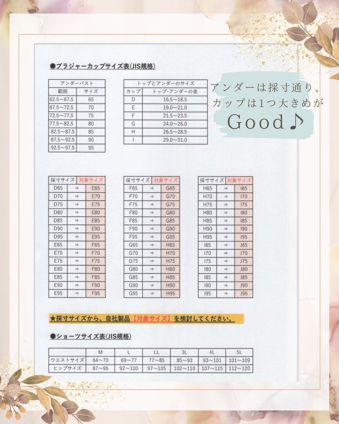 ※自社製品は、補正効果がある為、通常採寸サイズより1カップ大きめを選択ください。